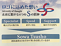 | 創…創造と改善をテーマにチャレンジしていく。 和…関係する皆様とコミュニケーションを図る。 通…常に新しい情報を収集し提供していく。 商…正しい経営をし生活の安定を図る。 |
